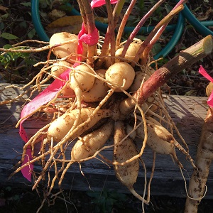 - Use a pitch fork to gently pop your dahlia tubers up out of the ground, taking care not to puncture the tubers. If you do, don’t worry too much since the tuber you planted in spring has likely multiplied several times over the growing season.