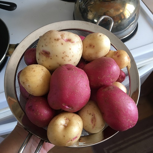 5. Dice 8 medium garden potatoes (white, red or variety of your choice!) and add to pot of boiling soup stock. (Add more water to cover potatoes if needed).