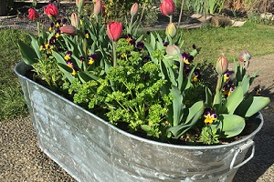 Spring Beauty Herb Planter $195 This durable and chic galvanized steel tub, complete with rolling casters, is filled with herbs, edible viola flowers and the added bonus of spring tulips! Measures 32.5" long x 15" wide x 12" tall. Local delivery available from Cedar to Lantzville.